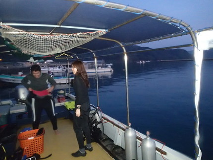 すでに時間は18時、薄暗くなり始め。そして今回は船に乗ったものの岸壁に船を着けたままなんとこの場所でナイトダイビング。